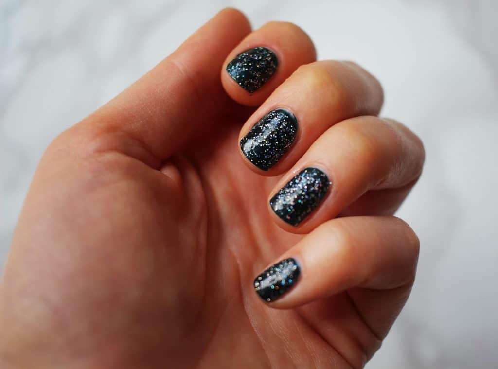 Want to take it up a notch? Try applying a glitter polish over the dark base. This immediately gives nails a festive look you can’t ignore. I used Champange for Breakfast by